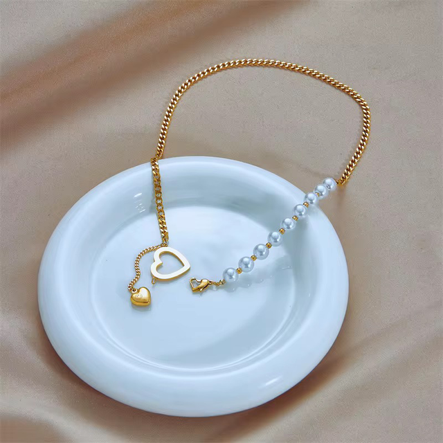 Amore Collana in acciaio inossidabile, placcato in oro 18k, con perline naturali.