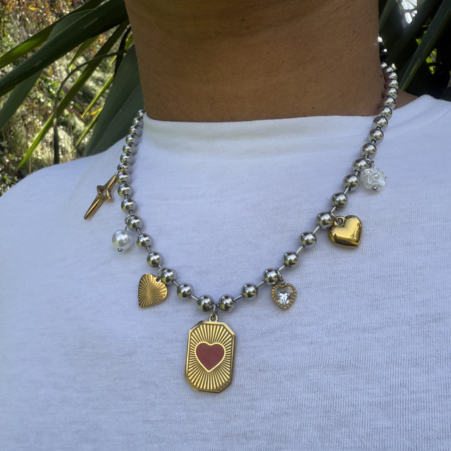 Collana mix silver e gold, in acciaio inossidabile, multi charme, con placcatura 18k PDV, non cambia colore, ed è resistente all’acqua.
